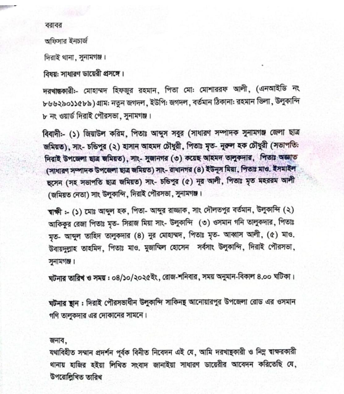 গত শনিবার বিকেল বেলা হিফজুর রহমান দিরাই পৌর শহরের নিজ বাসার পাশে ওসমান গনির দোকানের সামনে বসা ছিলেন। এসময় সুনামগঞ্জ জেলা ছাত্র জমিয়তের সাধারণ সম্পাদক জিয়াউল করিম,উপজেলা ছাত্র জমিয়তের সভাপতি হাসান আহমেদ চৌধুরী, সাধারণ সম্পাদক কয়েছ আহমেদ সহ কয়েকজন তার সামনে যায়।এরপর তাকে উদ্দ্যেশ্য করে বলে তার ছেলে লন্ডন প্রবাসী সাইফুর রহমান ফেইসবুকে তাদের একটি মিছিলের ব্যানারে ক্রস চিহ্ন দিয়ে মিছিলের বিরুদ্ধাচরন করেছে। এর পর এক সাথে সবাই উনাকে বিভিন্ন ভয়ভীতি ও হুমকি দিয়ে বলতে থাকে তার ছেলে যেন ফেইসবুকের স্ট্যাটাসটি অবিলম্বে ডিলিট করে দেয়। এই বিষয়টি ছেলেকে জানানোর জন্য চাপ সৃষ্টি করে এবং যদি ডিলিট না করে মারাত্মক অসুবিধা হবে বলে তারা হুমকি দেয়। এতে তিনি ভীত সন্ত্রস্ত হয়ে পরেন। এব্যাপারে তিনি নিরাপত্তা চেয়ে থানায় লিখিত দিয়েছেন। দিরাই থানা অফিসার ইনচার্জ মোহাম্মদ আব্দুর রাজ্জাক লিখিত অভিযোগের সত্যতা নিশ্চিত করেছেন।।