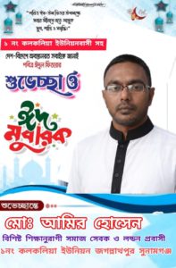 পবিত্র ঈদুল ফিতর উপলক্ষ্যে জগন্নাথপুর উপজেলার 1 নং কলকলিয়া ইউনিয়নবাসীকে যুক্তরাজ্য প্রবাসী সমাজসেবক আমির হোসেনের ঈদ শুভেচ্ছা।